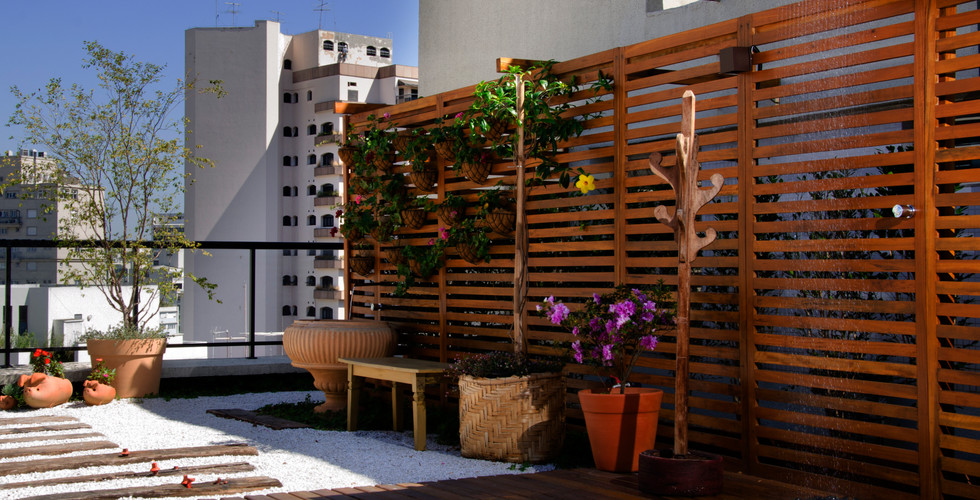 Criamos diversos espaços e com muitos usos, de um lado o Gourmet, com fogão a lenha feito de tijolo de demolição. Do outro, os dormentes de madeira reaproveitados de trilhos de trens e pedrisco, temos um estar que no frio se torna um fogo de chão, Os bancos, cada um de um tipo, foram todos reaproveitados e restaurados pela própria cliente. Ao redor deste espaço plantamos frutíferas em vasos como Jabuticabeira, Pitangueira e Limão cravo e bacias com flores para compor.